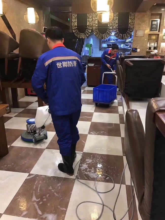 吉林市百年石鍋飯大東門店2017.10.15日晚,防滑工程結(jié)束!以后顧客可以安心用餐。有地面濕滑問題,就找 世卿防滑。