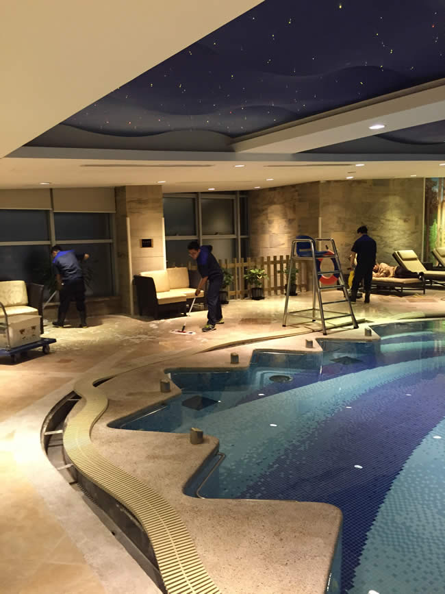 祝賀世卿防滑防護(hù)科技有限公司于2015年6月完成舟山嵊泗豐華國(guó)際大酒店的地面防滑施工工程。 上海世卿防滑防護(hù)科技有限公司專業(yè)研發(fā),生產(chǎn),銷售地面防滑材料,并承接大面積防滑工程,專業(yè)施工團(tuán)隊(duì),為您上門服務(wù)!我們堅(jiān)持秉承創(chuàng)造綠色環(huán)保、營(yíng)造安全健康,創(chuàng)新發(fā)展、不斷超越的經(jīng)營(yíng)理念以及客戶至上的核心價(jià)值觀,一直在努力做對(duì)社會(huì)有意義的事! 市北高新商務(wù)中心坐落于江場(chǎng)三路258號(hào),由上海市北高新(集團(tuán))有限公司投資建設(shè)。簡(jiǎn)約的建筑外表搭配Art Deco的內(nèi)部裝飾,為您提供一個(gè)社交商務(wù)、會(huì)務(wù)宴請(qǐng)、私人聚會(huì)、休閑娛樂的商務(wù)社交平臺(tái)。盡善盡美的個(gè)性服務(wù),無(wú)微不至的悉心關(guān)懷,使市北高新商務(wù)中心處處散發(fā)著尊貴的氣息。中心近一萬(wàn)平方米,共分五層,包羅萬(wàn)象:專業(yè)的健身中心為您帶來(lái)健康生活理念;頂級(jí)餐廳設(shè)施包括氣派典雅的中餐廳、高端悠閑的西餐廳、奢華尊貴的紅酒雪茄室、環(huán)境優(yōu)雅的大堂吧、多功能廳及音樂廳,奉獻(xiàn)給您東、西方飲食文化新境界;一應(yīng)俱全的宴會(huì)廳、會(huì)議室和影視廳,滿足私人宴會(huì)、各類展覽等多樣需求。高端頂級(jí)SPA,提供國(guó)際化的水療和按摩服務(wù),為您帶來(lái)健康生活的享受。上海市北高新商務(wù)中心游泳池地面材質(zhì)為釉面磚,最常見的這種材質(zhì)的地面一旦遇水非常濕滑,容易造成行人行走滑倒,存在極大的安全隱患,降低了工作人員的工作效率,經(jīng)過我司的防滑處理,保持著原有的地面原貌,也解決了客戶的地面濕滑問題,得到了上海市北高新商務(wù)中心的認(rèn)可和極高評(píng)價(jià)。我司專業(yè)承接地面防滑處理、瓷磚防滑處理、地磚防滑和大理石防滑處理工程服務(wù),以及銷售地面防滑產(chǎn)品——世卿防滑劑。歡迎致電咨詢:021-20981810。
